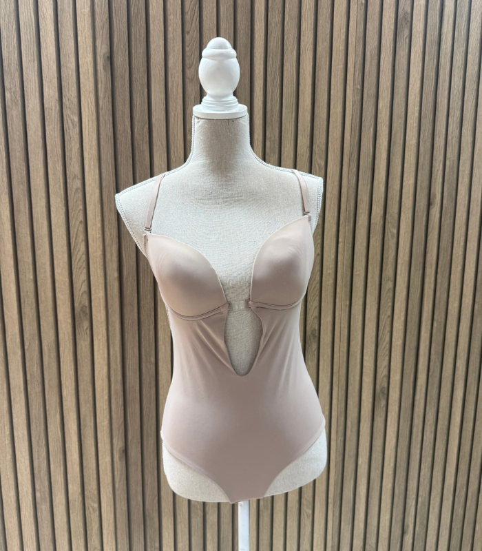 Body interior diseñado para ofrecer una sujeción discreta y efecto invisible bajo la ropa. Cuenta con parte delantera totalmente lisa, escote profundo hasta el ombligo y tirantes de silicona de sustitución que garantizan máxima sujeción sin marcar. Ideal para prendas escotadas o eventos donde se busca un acabado impecable y natural.