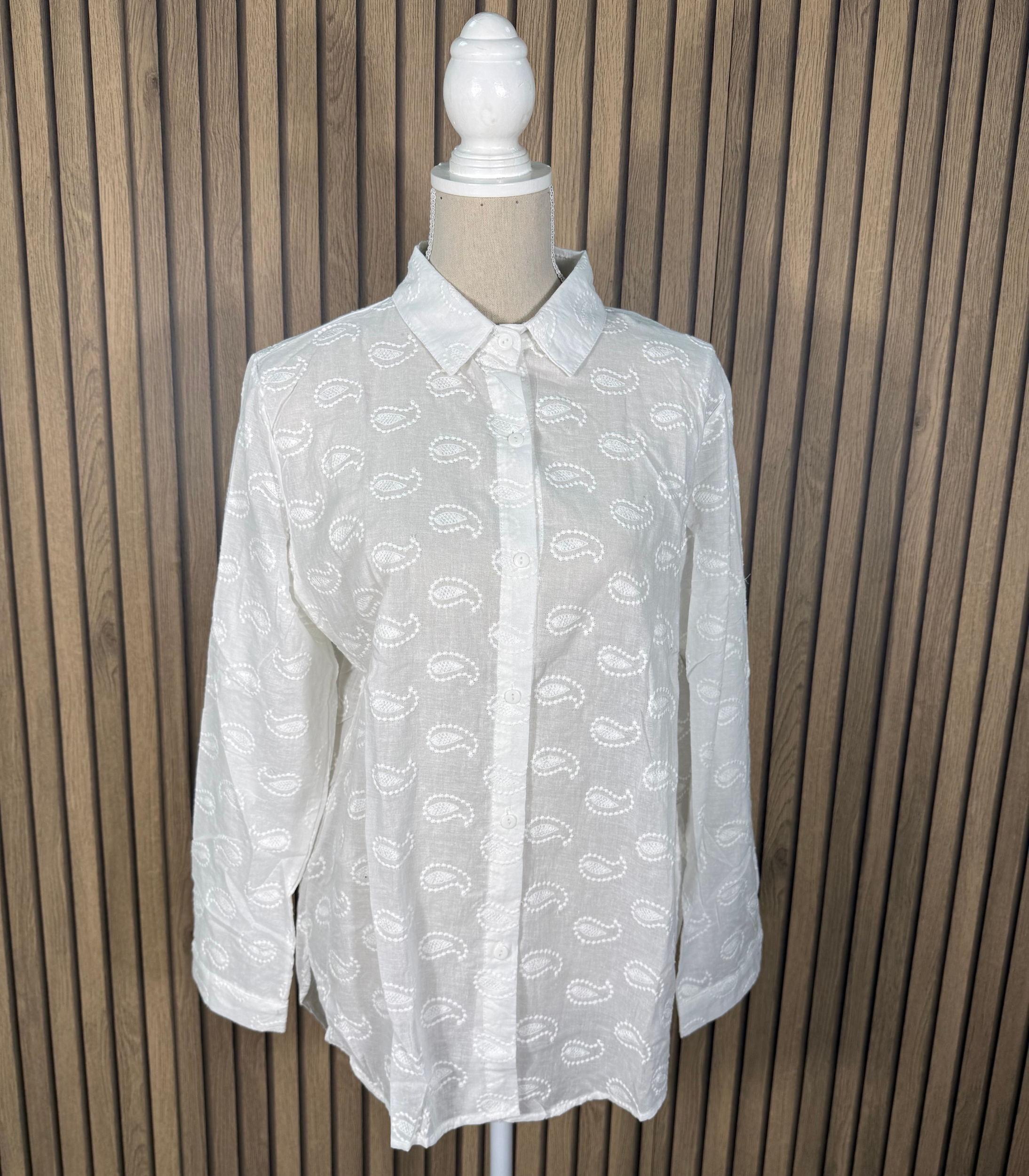 Camisa bordada con delicado diseño de motivos cachemir, confeccionada en un tejido suave y cómodo que se adapta al cuerpo manteniendo su forma. Un modelo elegante y atemporal, perfecto para crear looks sofisticados.