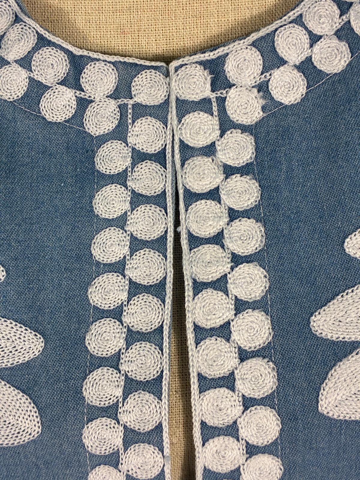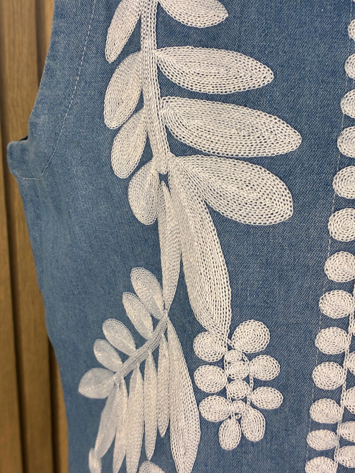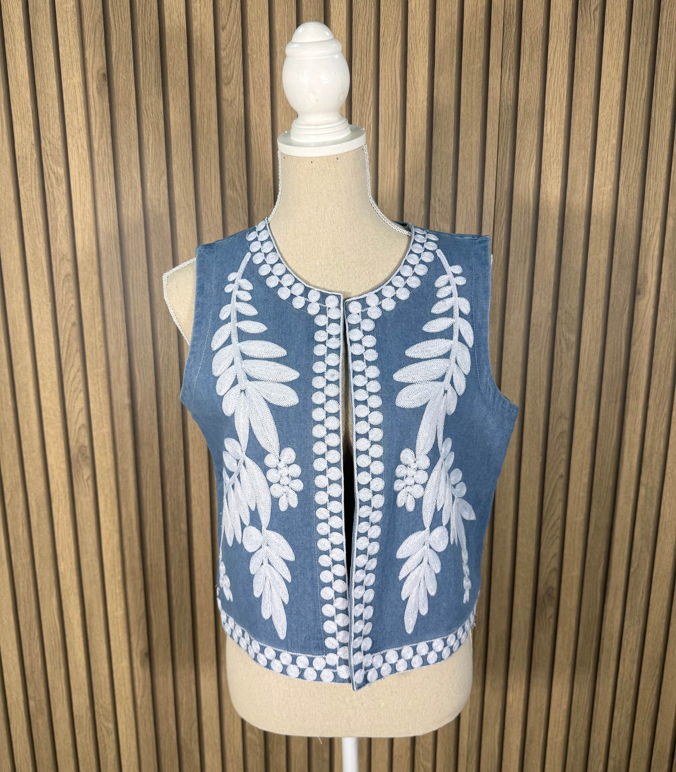 Chaleco denim en tono claro, sin cierre y con cuello redondo. Adornado con elegantes bordados en forma de hojas blancas que decoran toda la parte frontal y bordean el contorno con delicados detalles en el mismo tono. Largo hasta la cintura y confeccionado en un tejido cómodo y resistente (20 poliéster, 80% algodón). Una prenda versátil que aporta un toque distintivo y femenino a cualquier look.