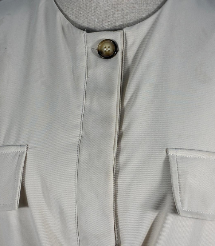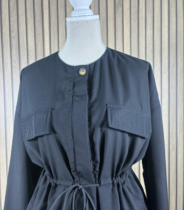 Chaqueta de estilo elegante y funcional, con cuello redondo y simulación de bolsillos con tapetas a la altura del pecho. Presenta primer botón visto y el resto ocultos para un acabado limpio y sofisticado. Incluye cordón ajustable en la cintura que permite adaptarla a la silueta. Confeccionada en 100% poliéster, es una prenda versátil ideal para completar looks tanto casuales como más arreglados.