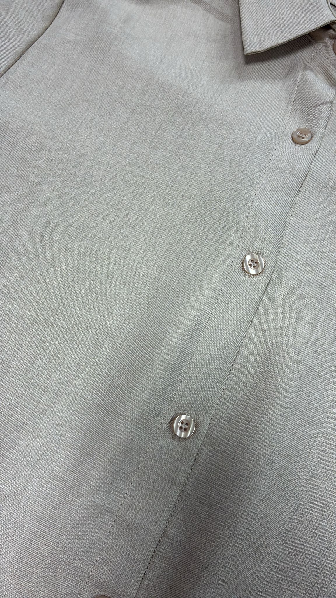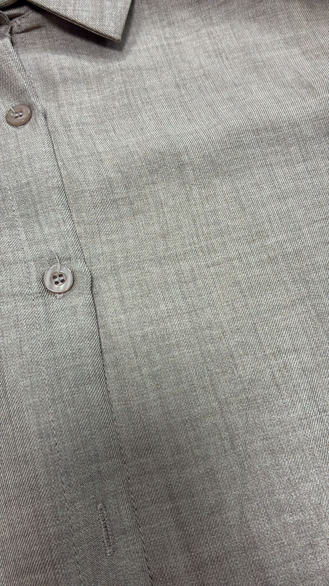 Conjunto de dos piezas confeccionado en tejido efecto lino, 100% poliéster. El pantalón presenta un corte recto y pata ancha, con cinturilla elástica que aporta comodidad y un ajuste perfecto. La chaqueta, de diseño largo y cuello camisero, se abotona en la parte delantera, ofreciendo un estilo atemporal y sofisticado.
