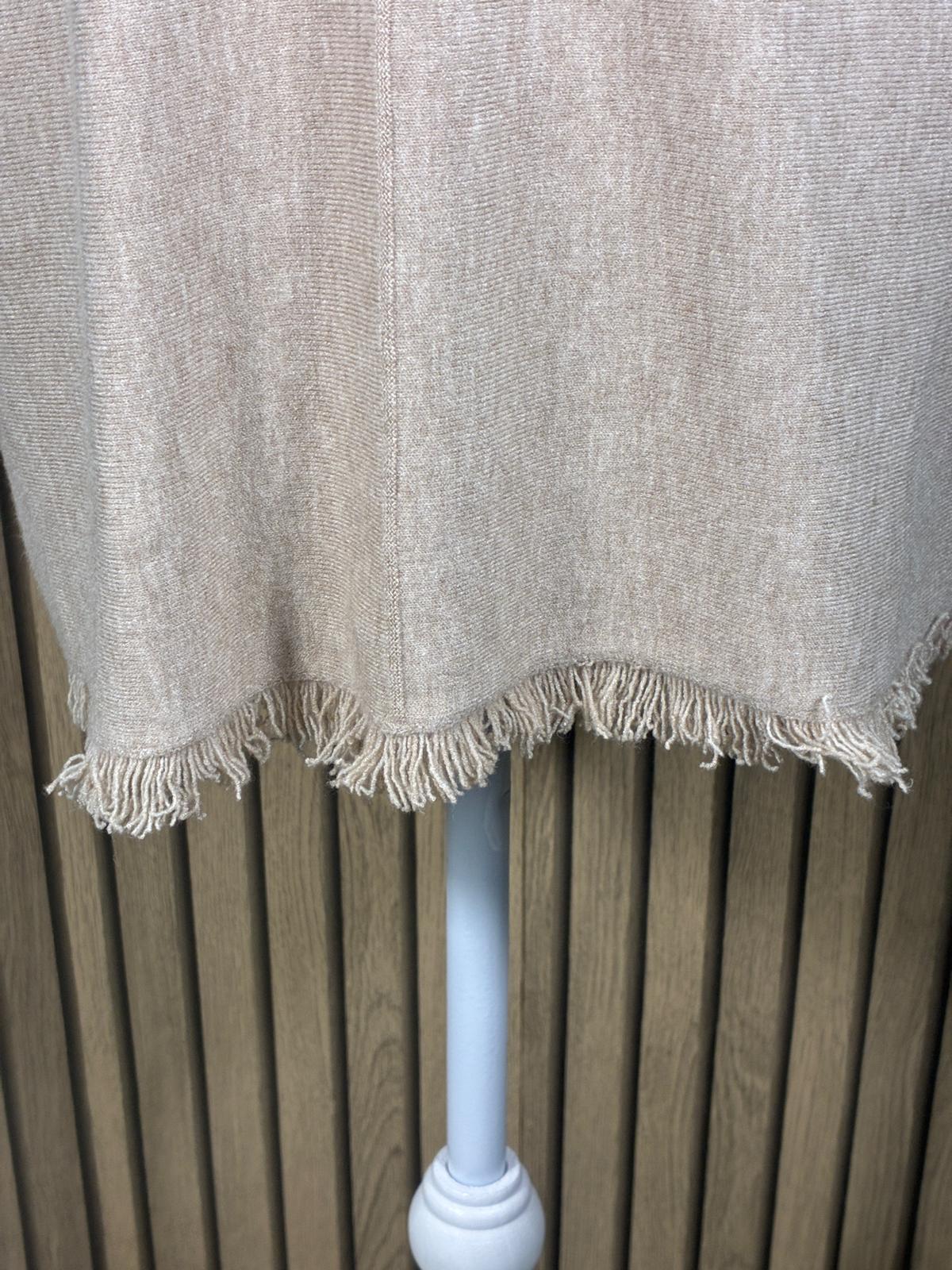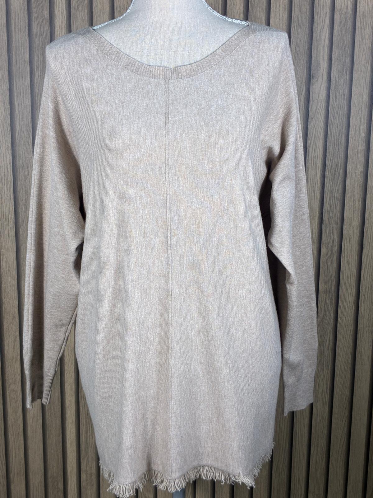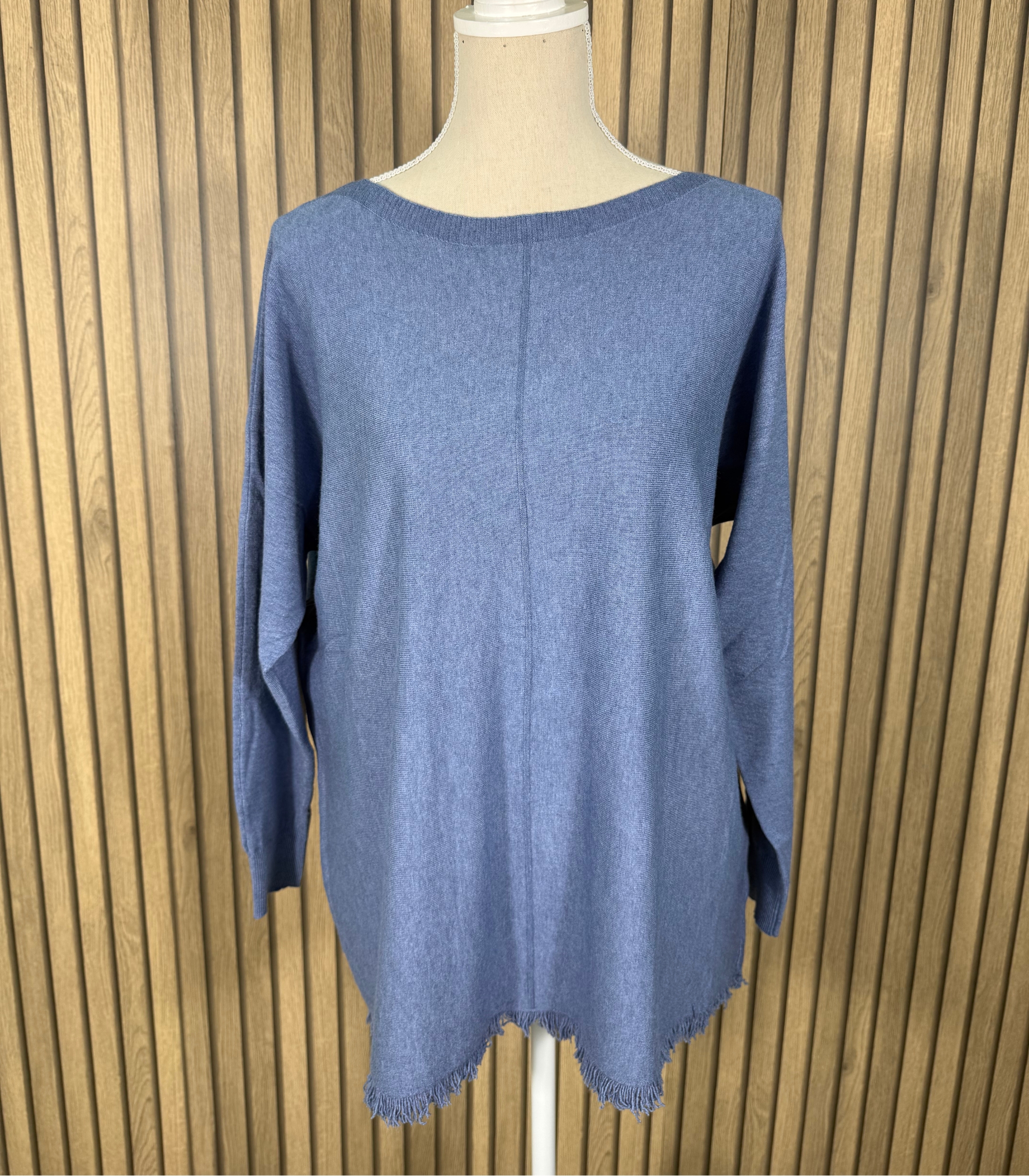 Jersey de estilo desenfadado y actual, con cuello barco y manga murciélago que aportan comodidad y movimiento. Su terminación desflecada en la parte inferior le da un toque moderno y bohemio. Disponible en varios colores, es una prenda versátil ideal para combinar con distintos estilos y ocasiones.