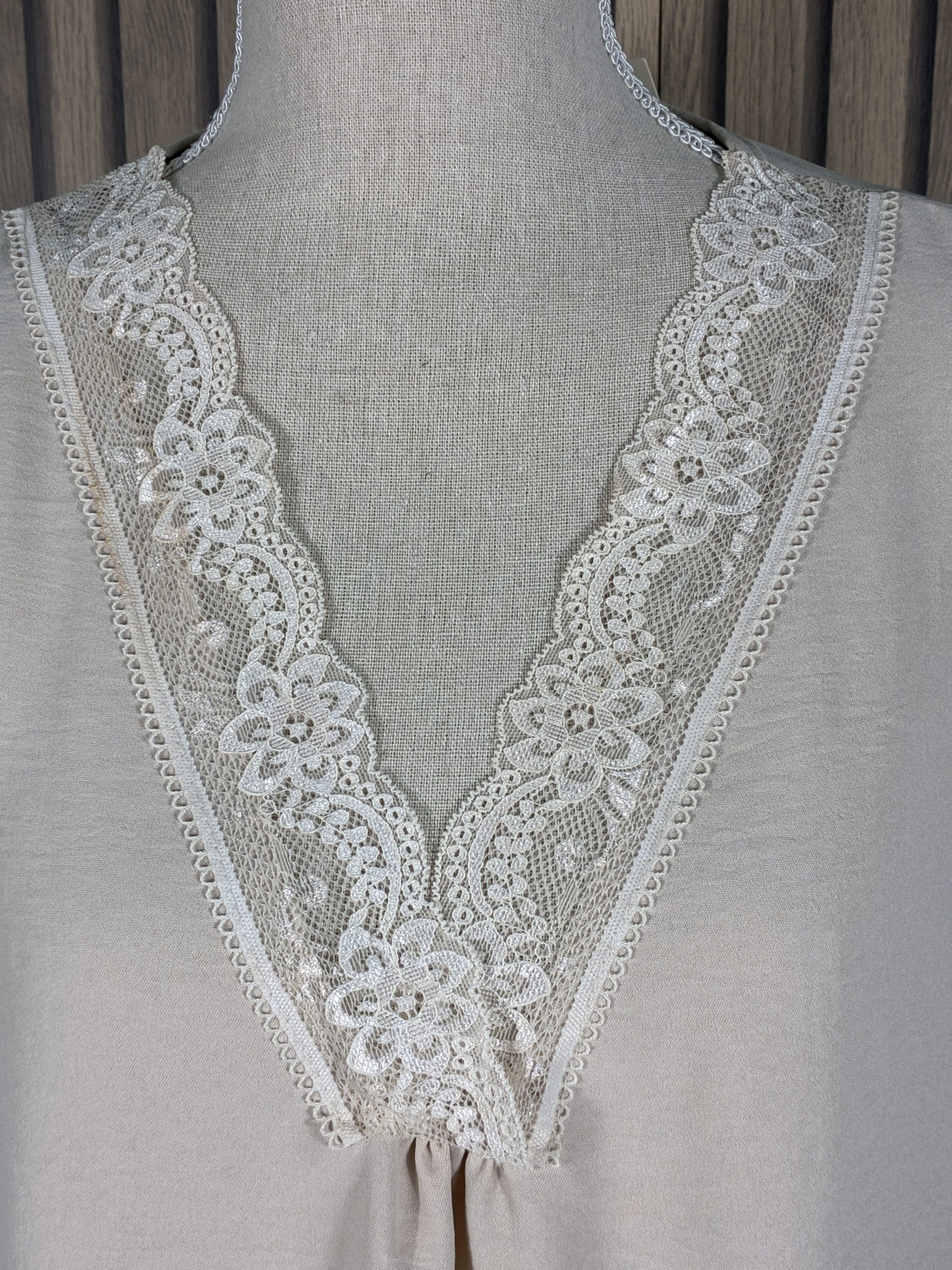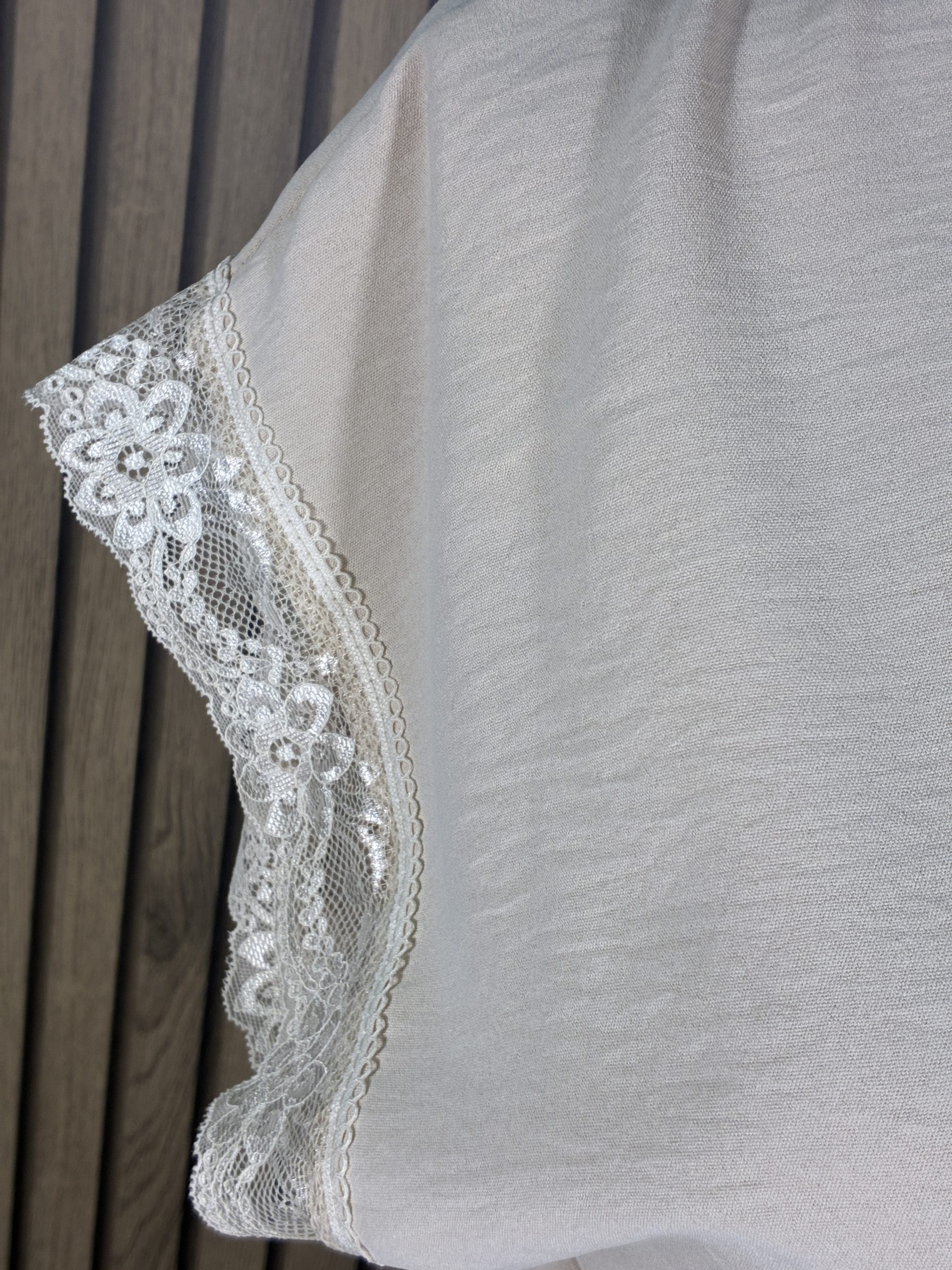 Lencero de manga corta, talla curvy en tono beige, confeccionado en un tejido suave y fluido de 50% poliéster y 50% viscosa. Su acabado satinado aporta un toque elegante y femenino, ideal para lucir tanto en looks casuales como más sofisticados. Una prenda versátil que combina fácilmente con pantalones, faldas o jeans.