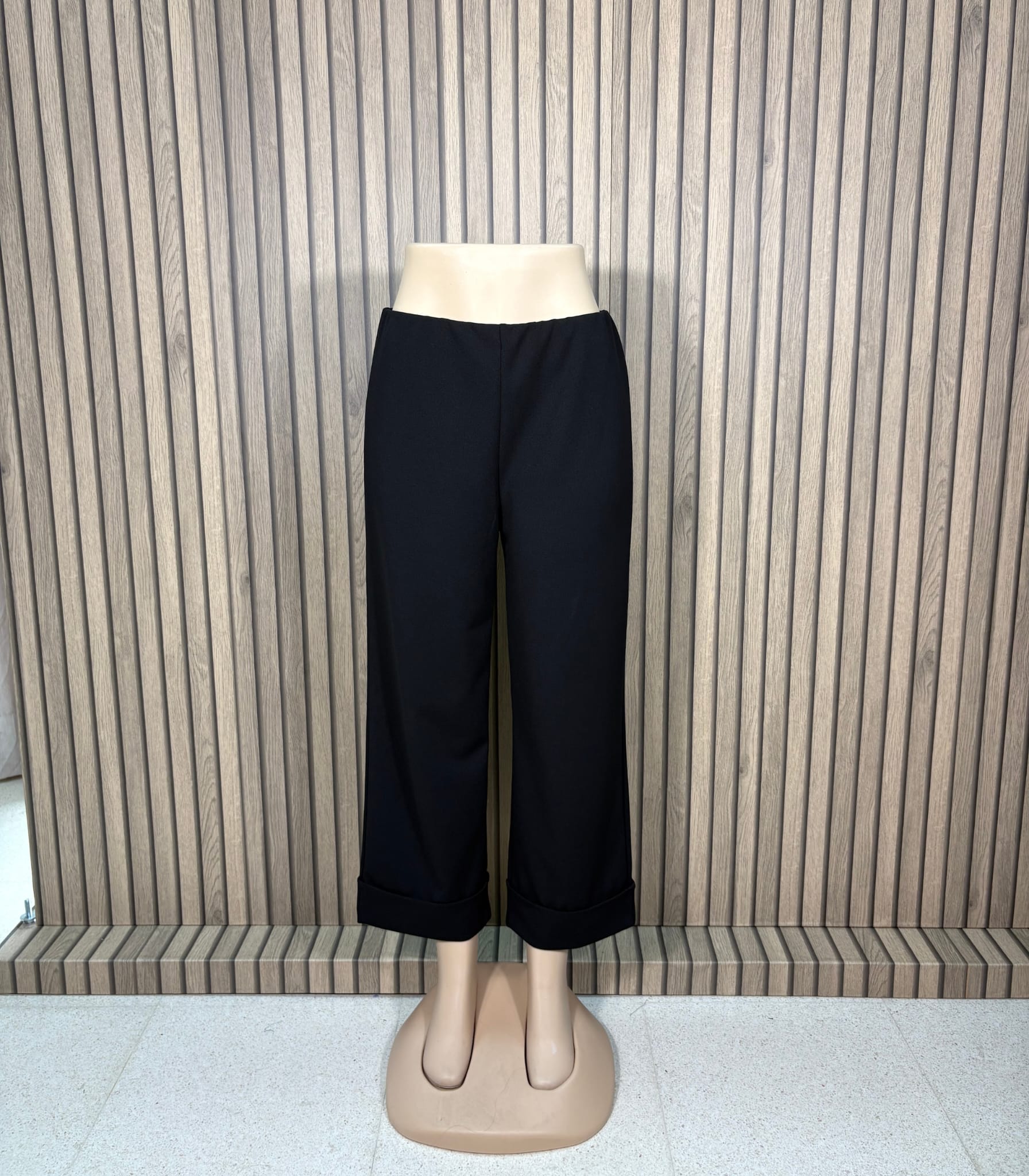 Pantalón de estilo elegante y cómodo, con cinturilla elástica disimulada en el propio tejido para un ajuste perfecto. Presenta un corte de pata ancha con vuelta en el bajo que aporta un toque moderno y fluido. Confeccionado en un tejido de 95% viscosa y 5% elastán, ofrece suavidad y elasticidad. Disponible en tres colores, es una prenda versátil ideal para cualquier ocasión.