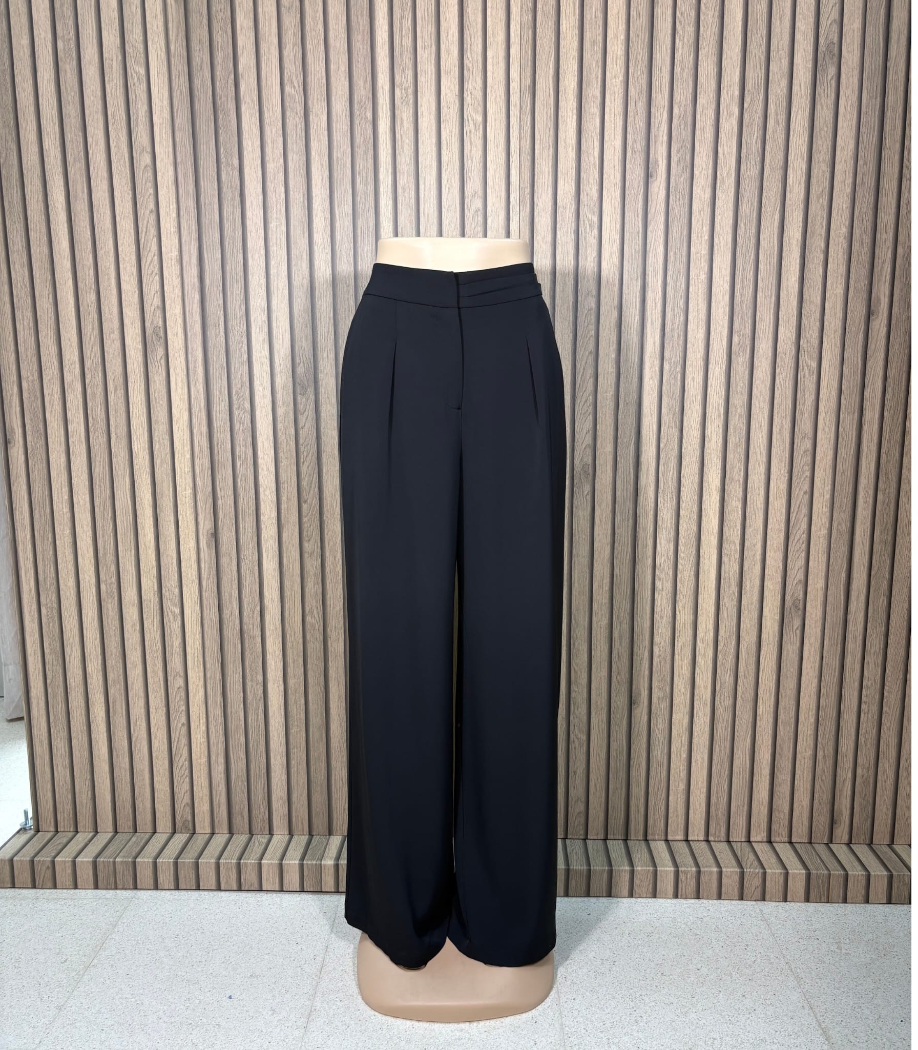 Pantalón de corte elegante con cinturilla decorada con tres arandelas metálicas en el lateral izquierdo, que aportan un toque distintivo y moderno. Presenta bolsillos laterales ocultos en la costura y pata recta, ideal para un estilo pulido y versátil.