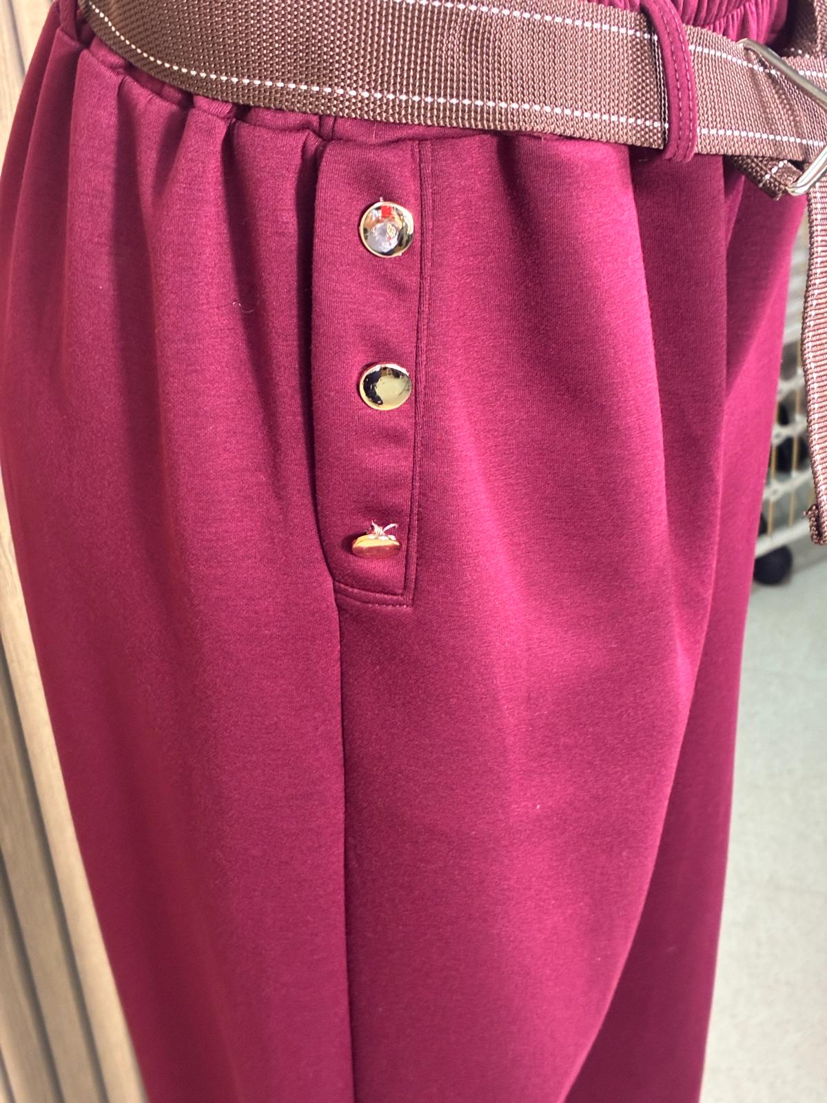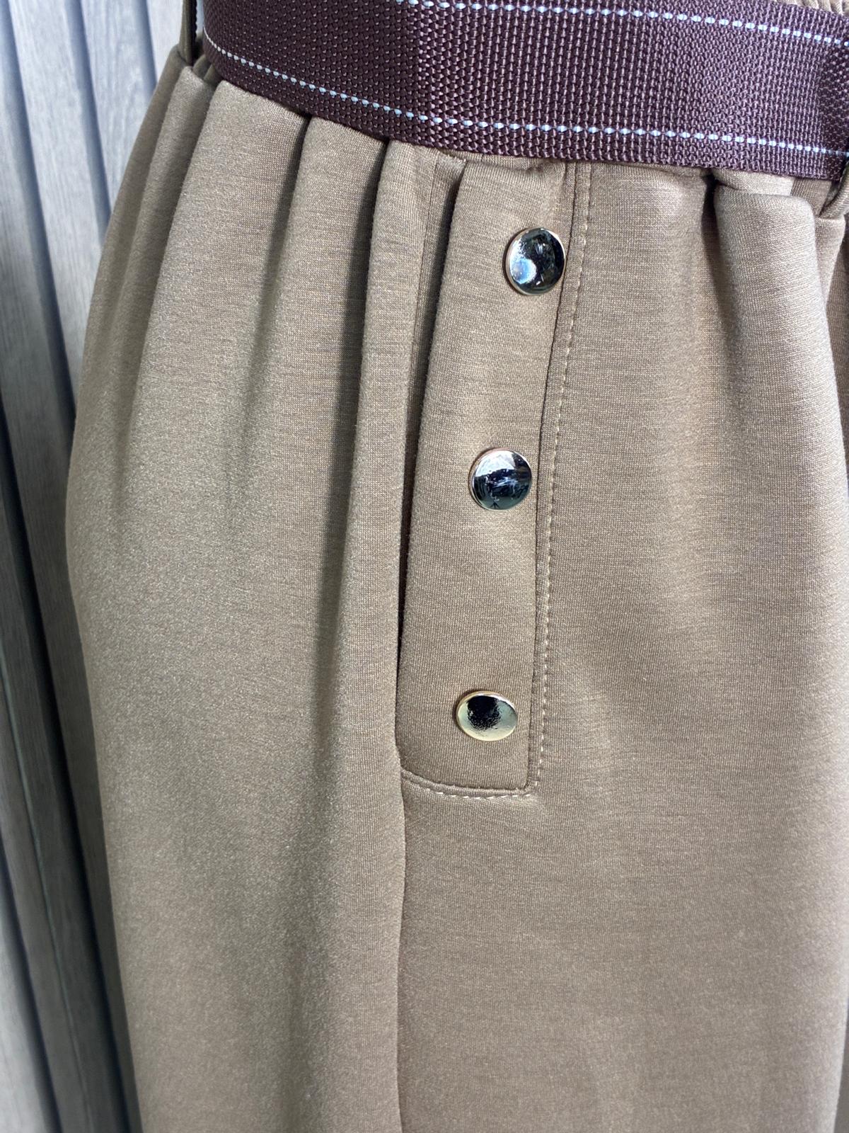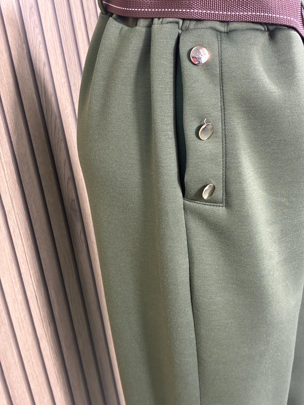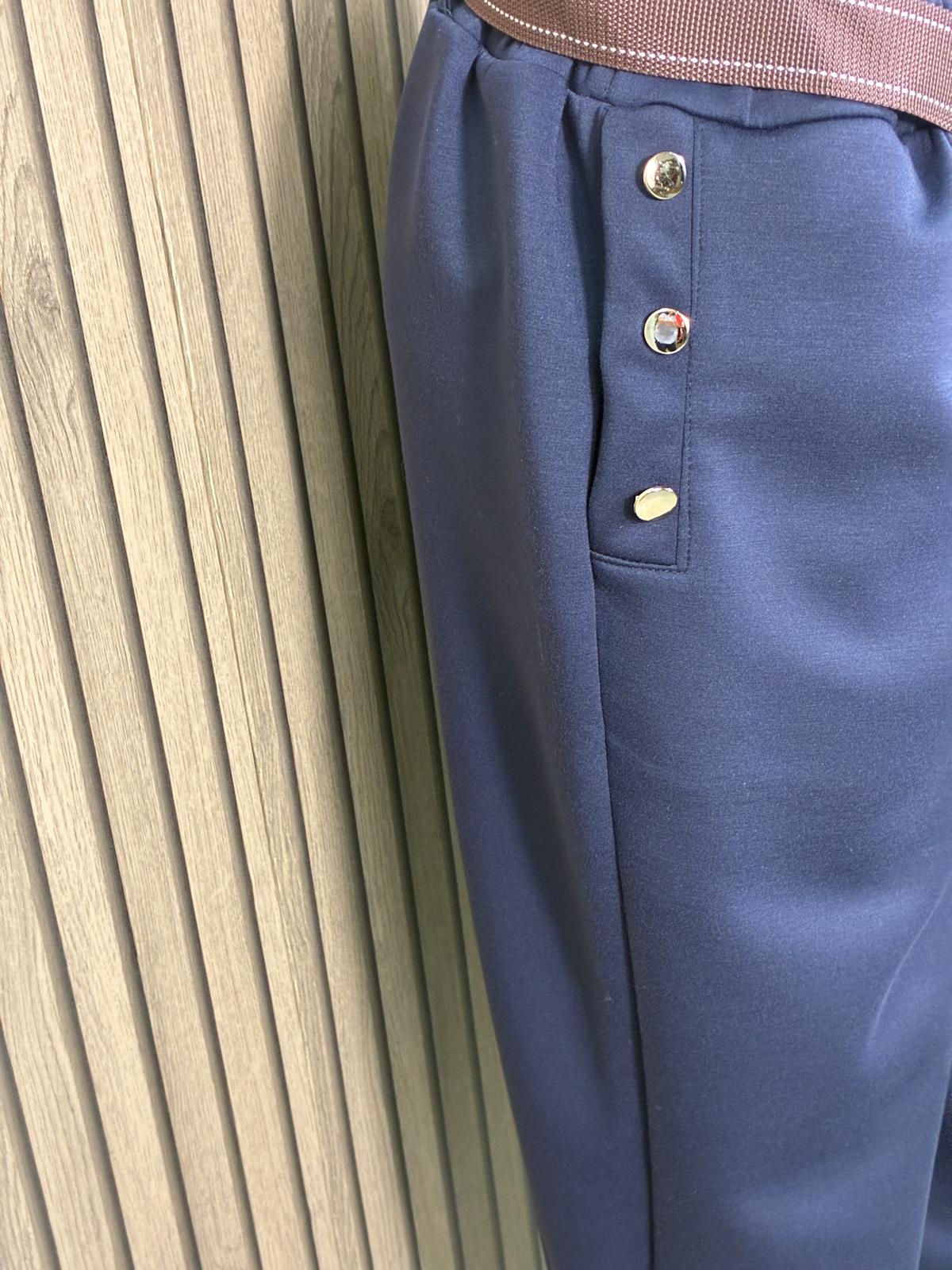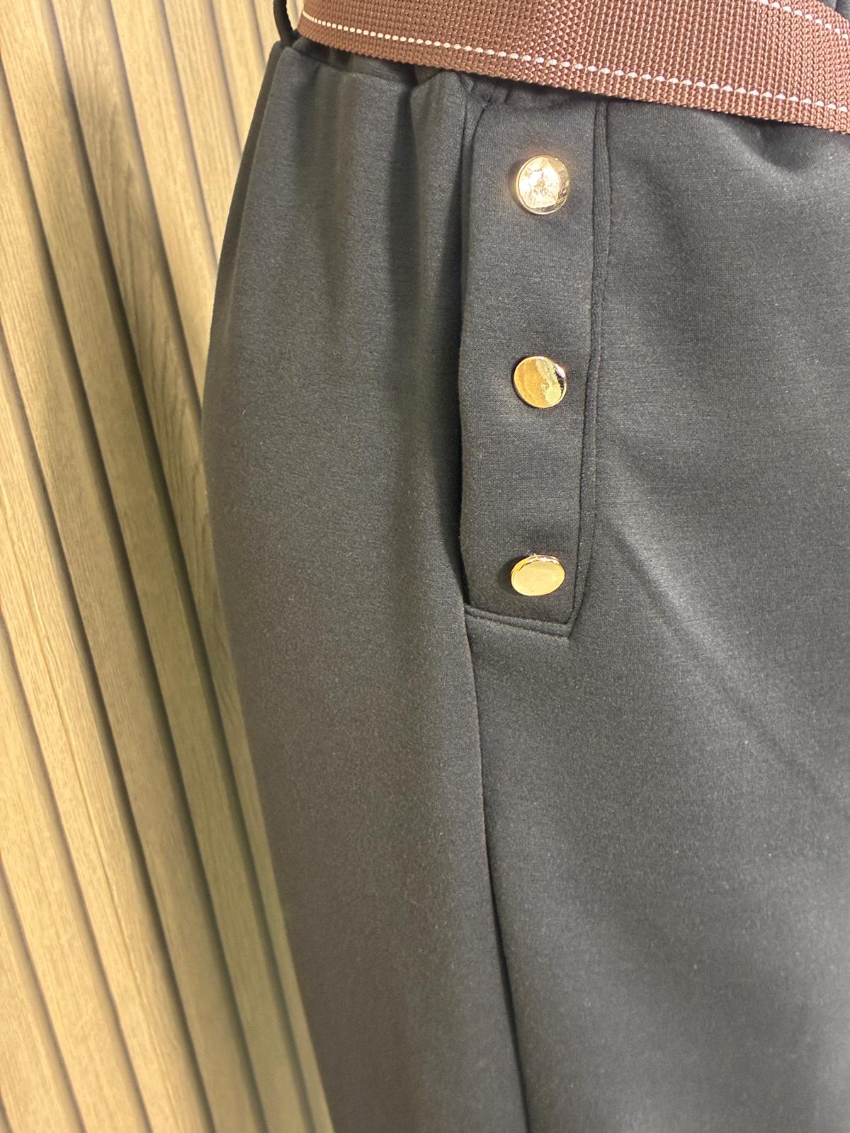 Pantalón con cinturilla elástica que garantiza comodidad y un ajuste perfecto. Cuenta con bolsillos laterales adornados con tres botones dorados que aportan un toque elegante. Incluye cinturón de nylon en tono marrón que complementa el diseño. Confeccionado en 95% viscosa y 5% elastán, ofrece suavidad y elasticidad. Disponible en varios colores, es una prenda versátil y sofisticada para el día a día.
