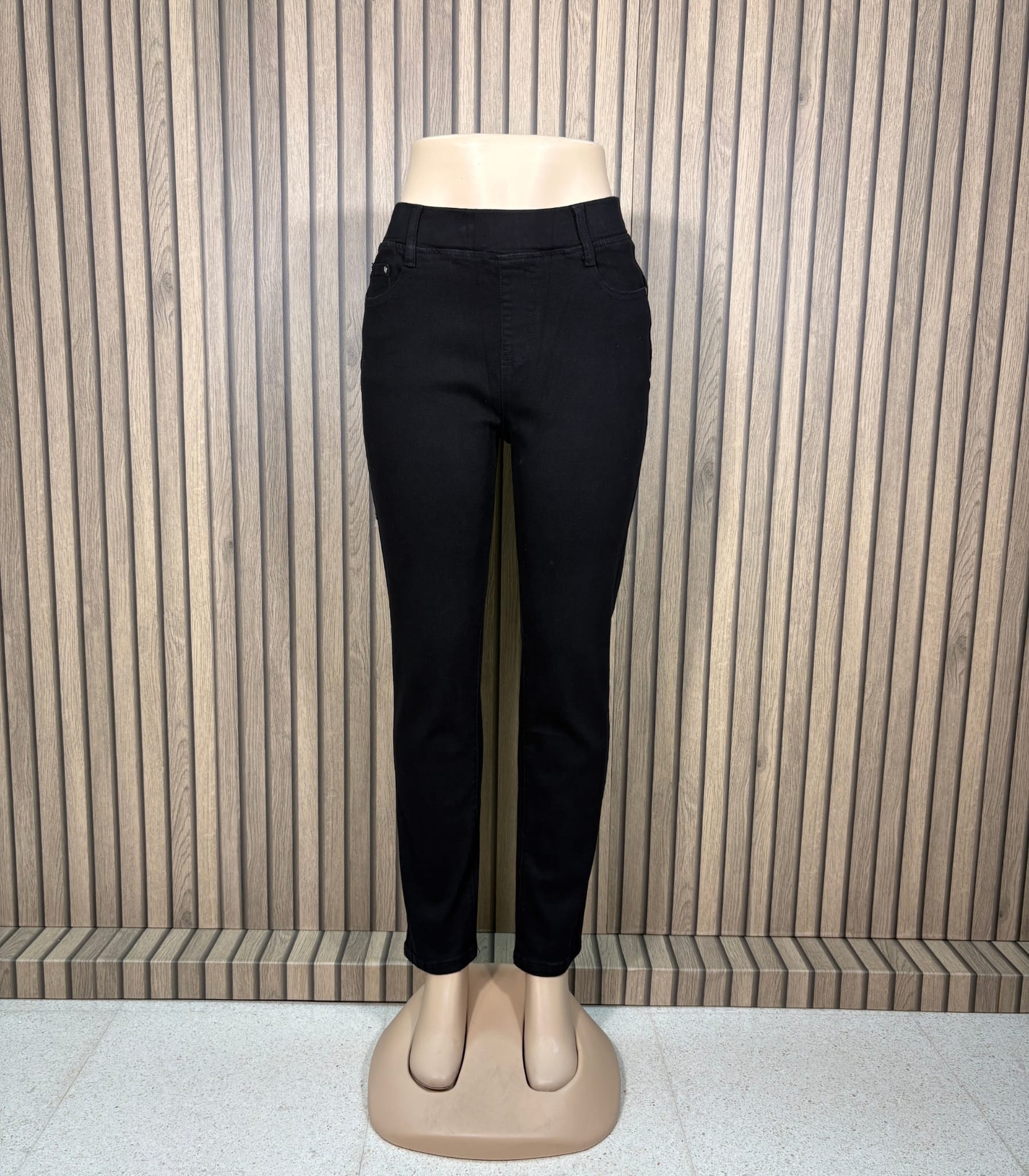 Pantalón vaquero en color negro con corte pitillo y cinturilla elástica, sin botón de cierre para mayor comodidad. Diseñado en tallaje curvy, se adapta y favorece la silueta ofreciendo un ajuste cómodo y estilizado. Un básico versátil para tu día a día.