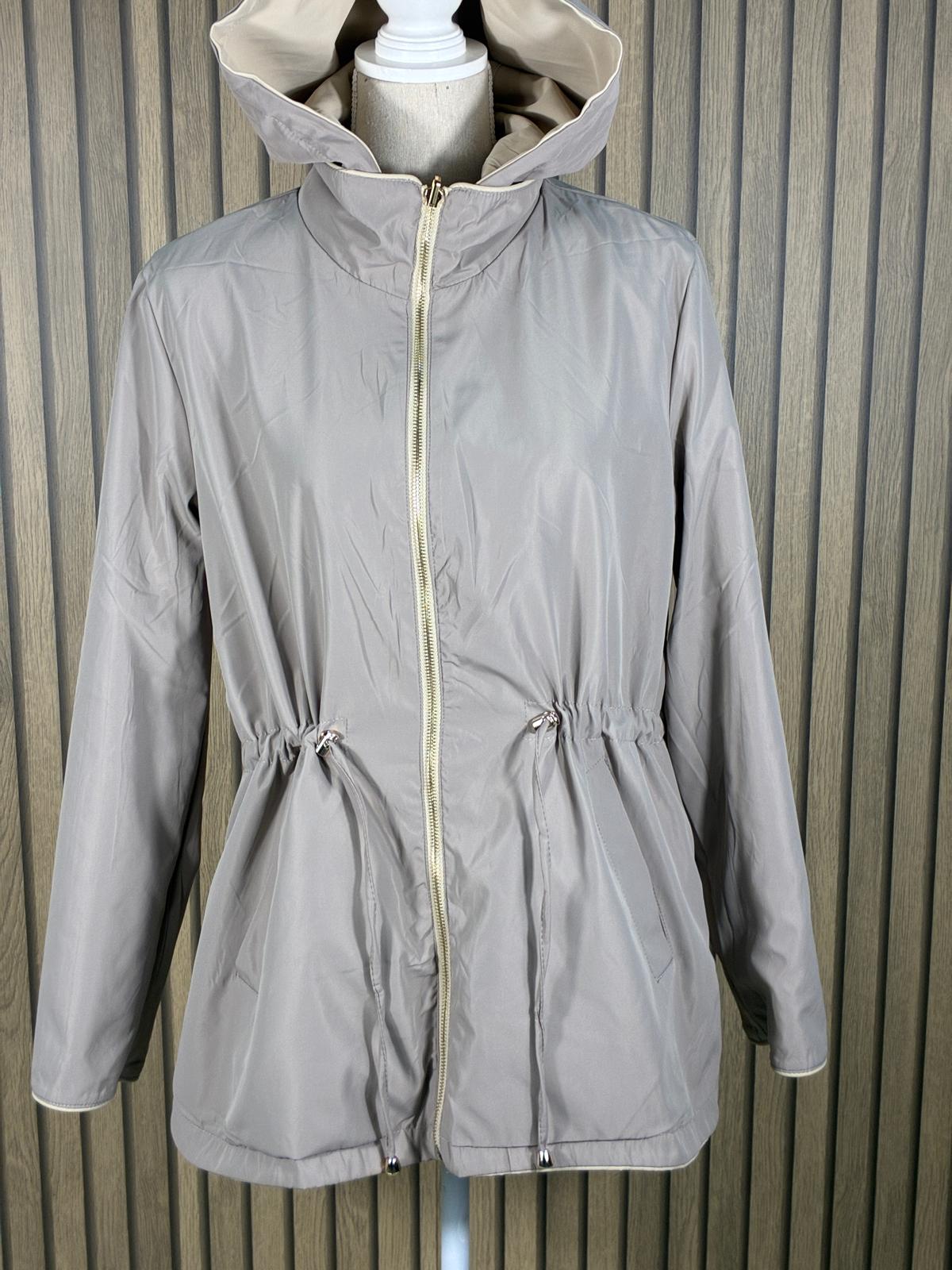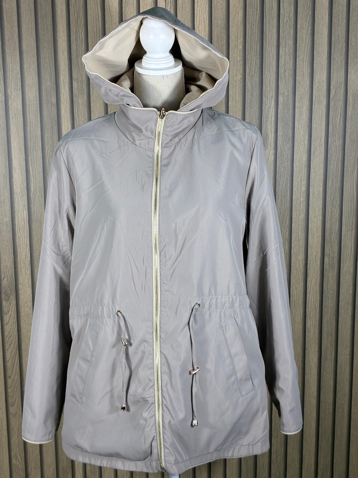 Parka reversible con un lado en tono camel liso y el otro con color topo. Incorpora gorro desmontable mediante cremallera, cierre frontal con cremallera oculta y botones click . Dispone de dos bolsillos laterales con cremallera y cinturilla ajustable con cordón interior a media altura. Una prenda práctica, cálida y versátil, ideal para lucir dos estilos en uno.