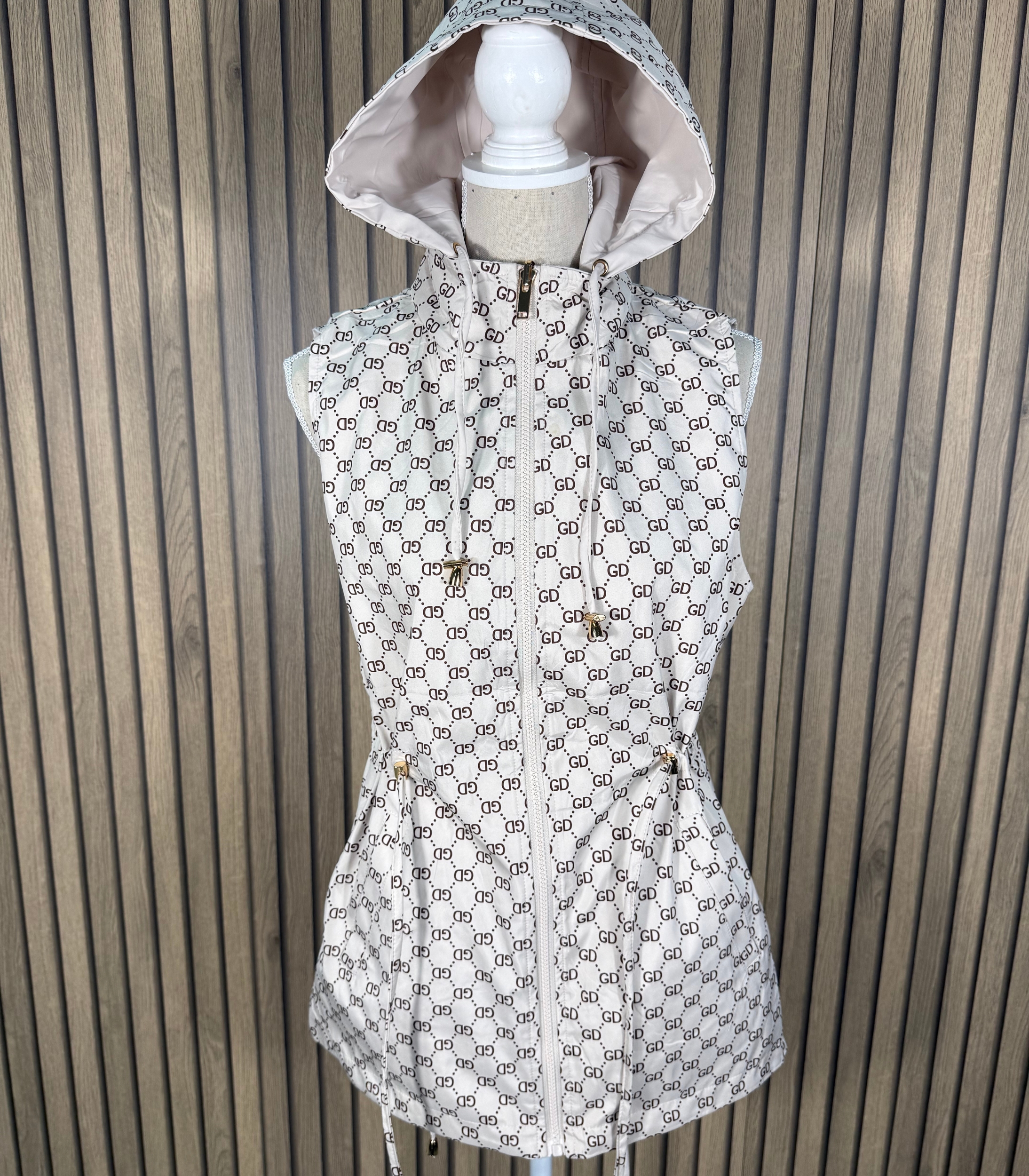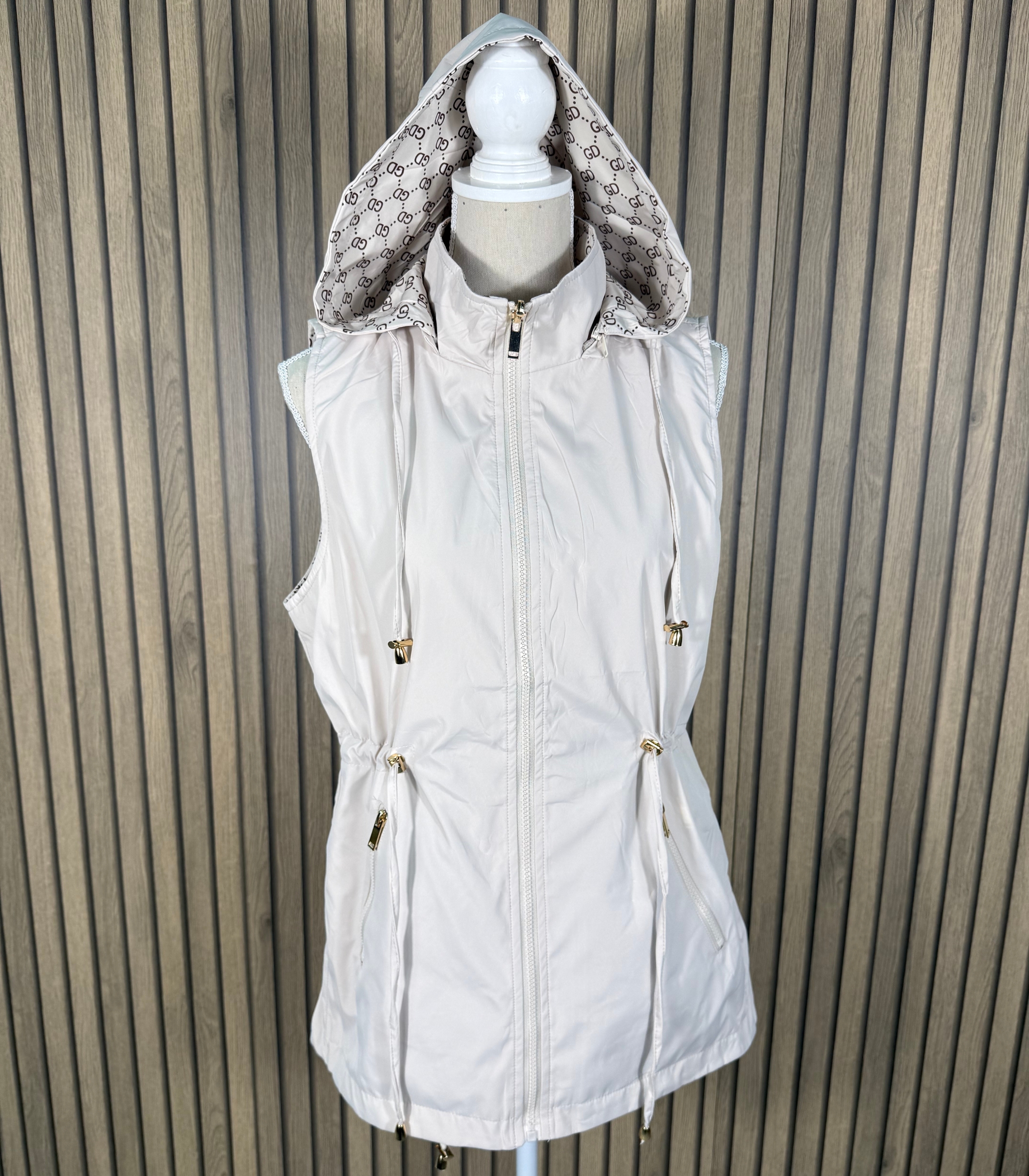 Parka sin mangas y reversible, con un lado en tono beige liso y el otro con un elegante diseño de pequeñas letras en tono marrón. Dispone de cordón interior en la cintura para ajustarla al gusto y realzar la silueta. Incluye gorro con cremallera, fácilmente desmontable, que aporta practicidad y estilo a esta prenda versátil y moderna.